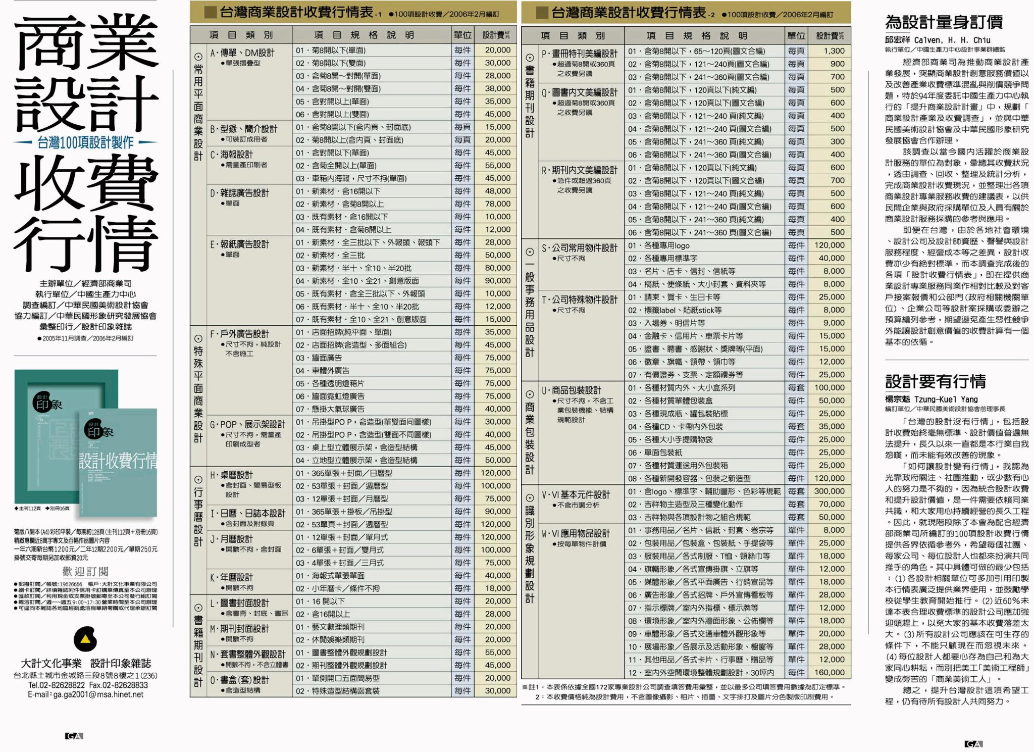 【台灣商業設計收費行情表-100項設計收費】於2006年2月由經濟部商業司委託中國生產力中心再委託民間設計協會單位合作編定